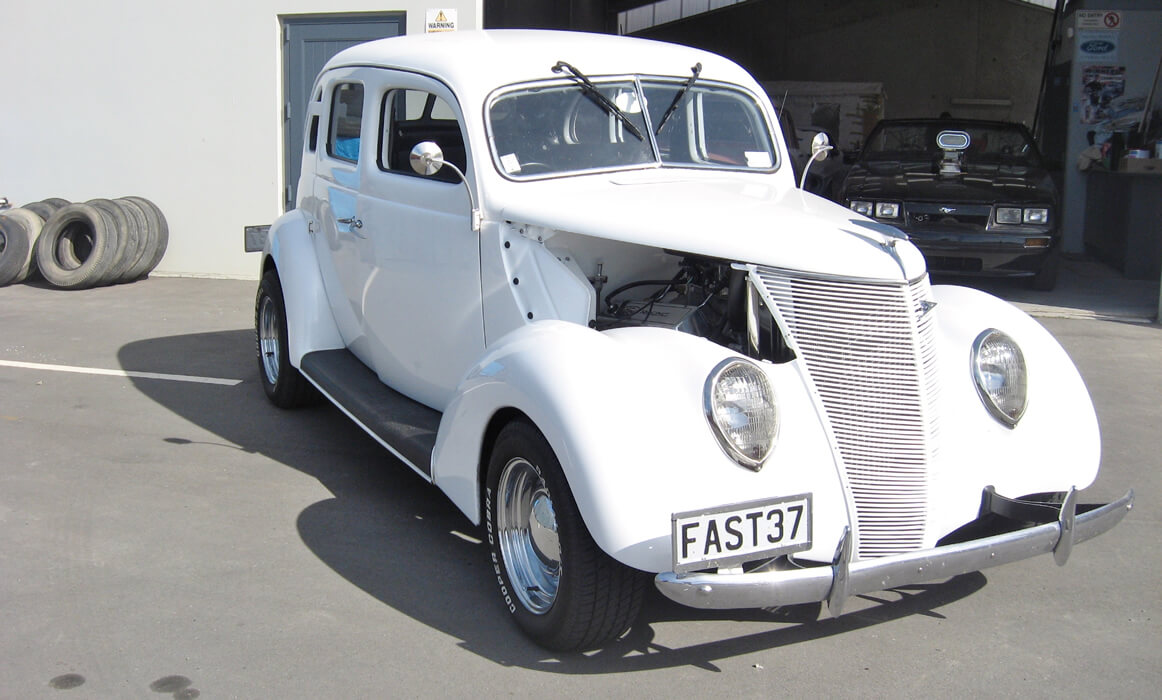 All panel work and fabrication was completed and the vehicle was Painted in a white pearl metallic. Upholstery was completed and motor work done.